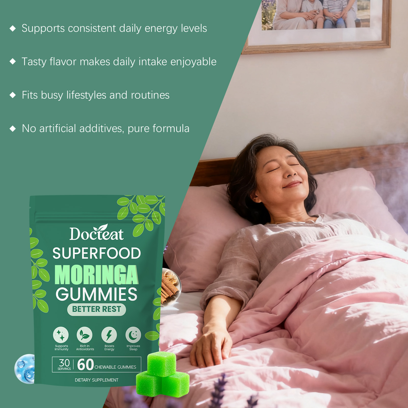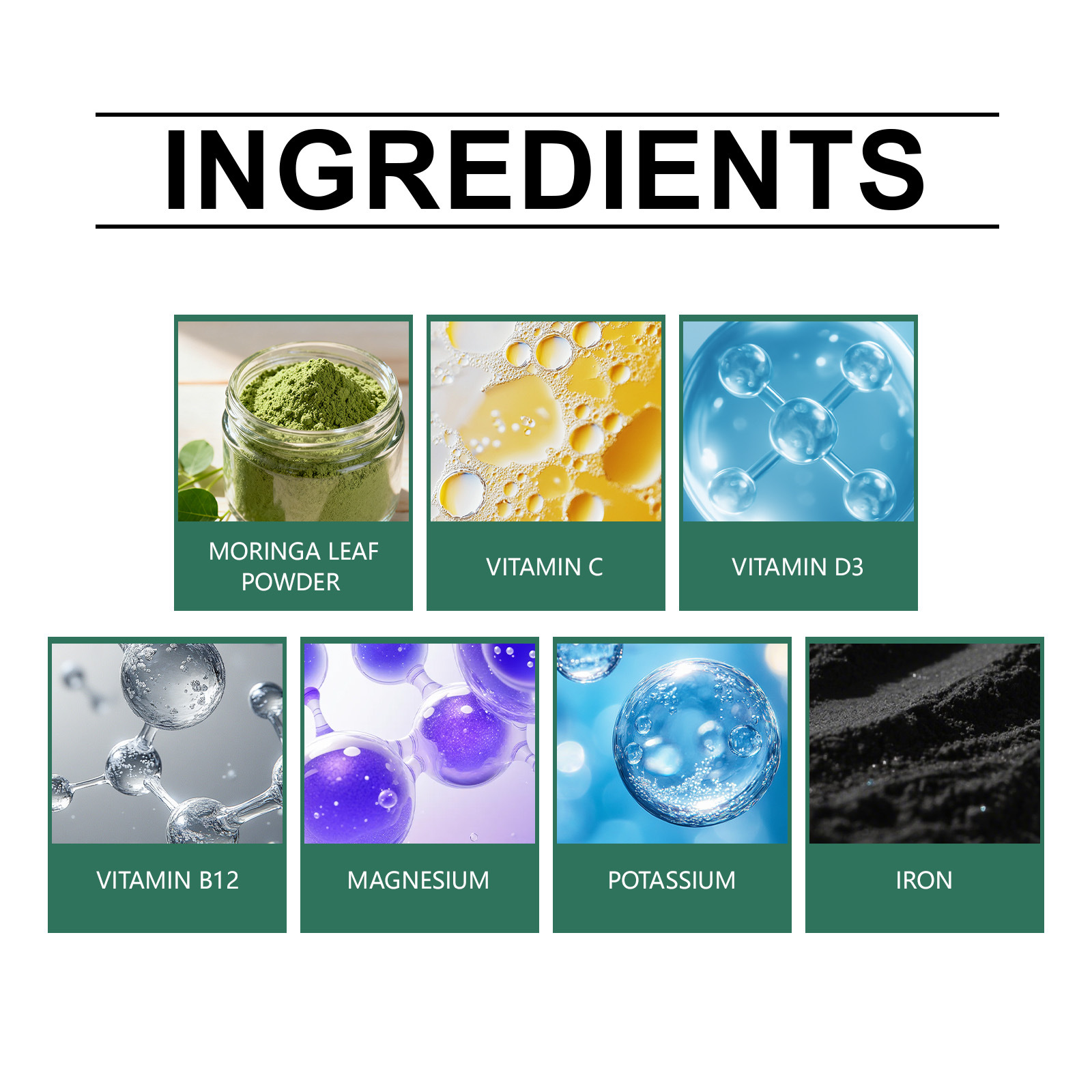 Ingredients: Moringa oleifera, vitamin C, vitamin D3, vitamin B12, magnesium, potassium and iron.